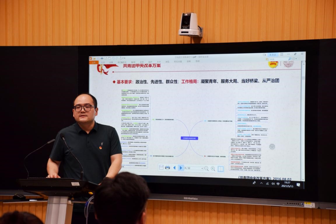 (通讯员:王超 席奥博)5月14日晚七时,在公司南校区C栋教学楼104室,物理与光电工程公司团委书记陈海涛以“把握功能定位,履行职责使命,推动公司团组织切实发挥政治功能”为主题,为公司团学组织全体员工干部讲团课。本次团课以线上线下相结合的形式进行,此前已下发相关学习资料,未到场员工干部通过腾讯会议在线上平台观看。本次团课由团委副书记刘泽霖主持,副书记席奥博做记录。