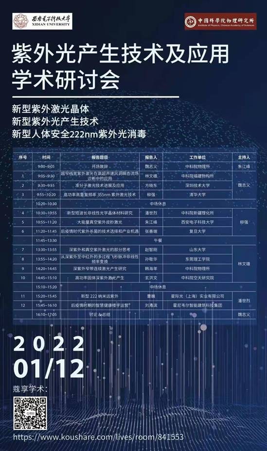 我国在新型紫外激光晶体、新型紫外光产生和新型人体安全222nm紫外光消毒等紫外光相关的领域具有世界领先的科技,不少成果也实现了转化应用。为了进一步探讨并挖掘紫外光产生技术及在灭菌杀毒、疫情防护等方面的应用,2022年1月12日,足球赌注网站联合中科院物理所举办“紫外光产生技术及应用研讨会”。研讨会针对紫外光的产生、紫外激光晶体技术以及紫外激光在消毒杀菌和智慧健康等领域的应用,邀请国内多个科研院所和科技企业进行交流讨论。星际光(上海)实业有限公司作为新型紫外光运用领域的领先企业,已将222纳米紫外光用于新冠消杀领域,作为嘉宾参加本次研讨会。