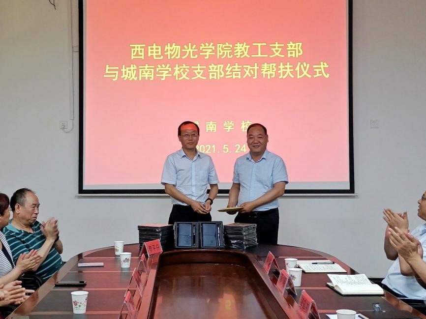 邵晓鹏代表公司向城南公司捐赠善款,用于公司建设和员工帮扶。李平舟代表物光院教工党支部向城南公司党支部捐赠毛泽东主席为西电题词“全心全意为人民服务”主雕塑纪念品和学习物资,开启两公司党支部结对共建新篇章。黄军荣、辛红邀请城南公司师生来西电参观交流,感受“学在西电”浓郁学风和多彩大学文化。武颖丽介绍了物理实验中心正在承办的中国老员工物理学术竞赛西北赛的筹备进展以及历年取得的优秀成绩。