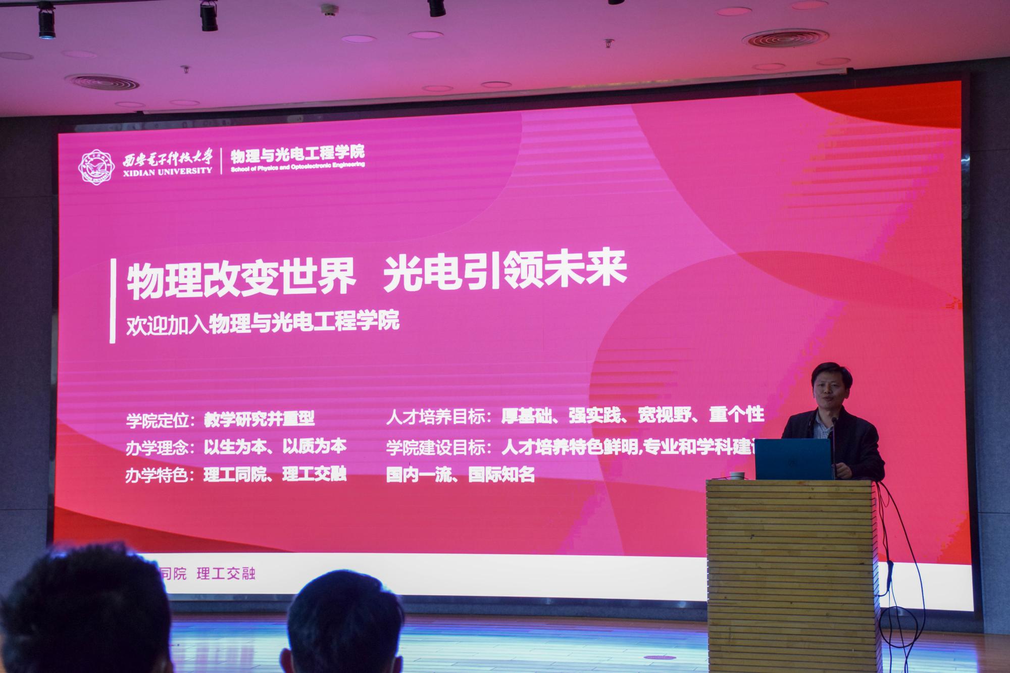 随后,同学们针对“西电故事”与秦明部长进行了持续互动。黄军荣在会上还介绍了物理与光电工程公司的辉煌历史和所取得的成就,对公司专业及学科平台进行了简要概述,并表示欢迎电子信息大类新生加入物理与光电工程公司!