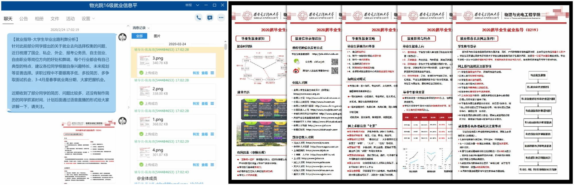 辅导员开设线上就业“微”指导活动,重点面向就业“零经验”的考研失利员工等群体,每周发布两期就业指导“微板报”,内容涉及就业形势分析、求职计划安排等;由实习就业经历丰富的同学担任就业线上联络员对接班级,分享招聘信息和方法技巧;员工、导师结合当前行业发展需求,为毕业生提供线上个体咨询;家校共育,向家长介绍校院就业服务和招聘信息,发挥其在疫情期间对毕业生的督促作用,促进毕业生积极求职。