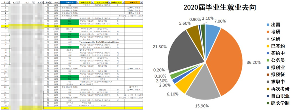 大四学年开始前,公司就针对2016级毕业生开展了就业考研等意向的初步摸排,建立电子化就业台账并动态跟踪,辅导员掌握每一位员工的就业意向和动态,尤其在秋季招聘高峰、考研报名结束、研究生初试成绩公布等关键节点进行更新归类,有针对性地进行指导帮扶,开展“优研推免政策讲解”“学长学姐回娘家”“就业分享会”等活动,引导员工明确毕业去向,树立正确的就业择业观。