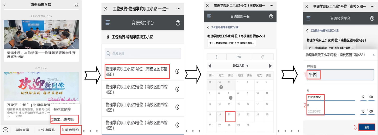 【预约方式】:微信公众号“西电足球赌注网站”-场地预约-职工小家预约-选择工位、日期-预约提交-预约成功(注:每人每天仅限预约1次工位)。