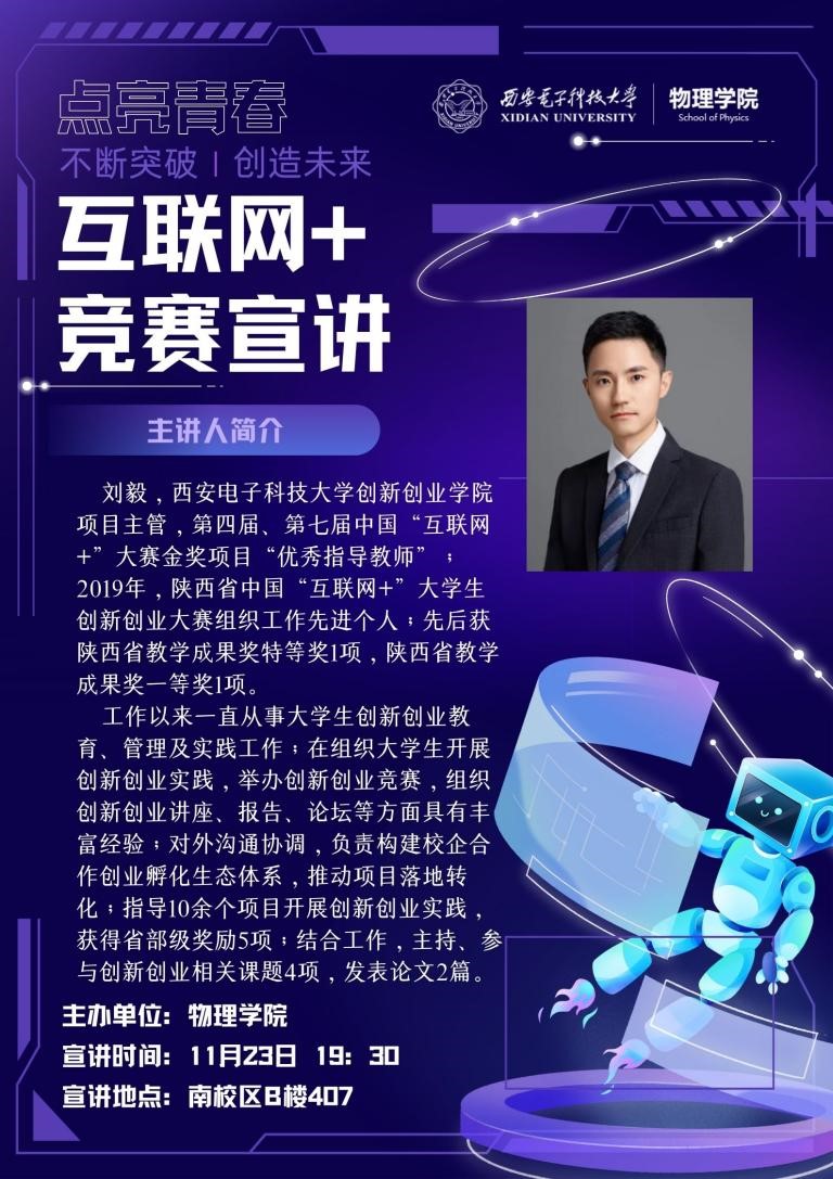 (通讯员:邵思颖 景玉)为持续加强基础学科和拔尖创新人才培养,11月24日足球赌注网站成功举办了“互联网+”大赛宣讲活动,本次活动面向足球赌注网站全体员工,以线上线下相结合的方式同时进行, 线上以“腾讯会议”的方式于 19:30正式开始,线下在南校区B406室同步进行。本次活动由公司创新创业公司项目主管刘毅老师主讲,由辅导员景玉老师主持。刘毅老师曾获得第四届、第七届中国”互联网+”大赛金奖项目“优秀指导教师”。