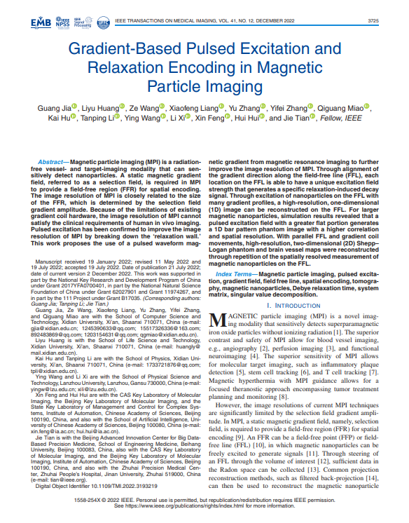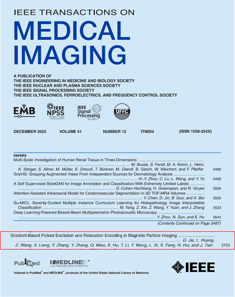 (通讯员 胡向涛)近日,足球赌注网站李檀平副教授作为通讯作者在医学图像领域顶级期刊IEEE Transaction on Medical Imaging(中科院JCR一区,Top期刊,影响因子=11.037)发表了题为“Gradient-Based Pulsed Excitation and Relaxation Encoding in Magnetic Particle Imaging”的学术论文,创新提出了基于梯度脉冲激励磁场进行空间编码的磁纳米粒子成像技术,并以朗之万方程为出发点,研究了磁粒子的动力学及热力学特性。
