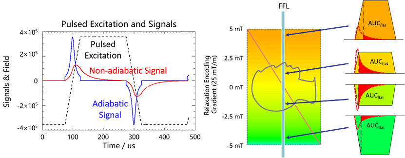 左图为在脉冲激励下,利用朗之万函数计算绝热信号,在脉冲激励的平坦部分,信号为零。采用德拜弛豫模型进行模拟仿真,由于弛豫效应,在平坦部分为拖尾信号。右图为弛豫衰减信号面积与脉冲激励场强呈非线性关系,可用于空间编码和高分辨率成像。
