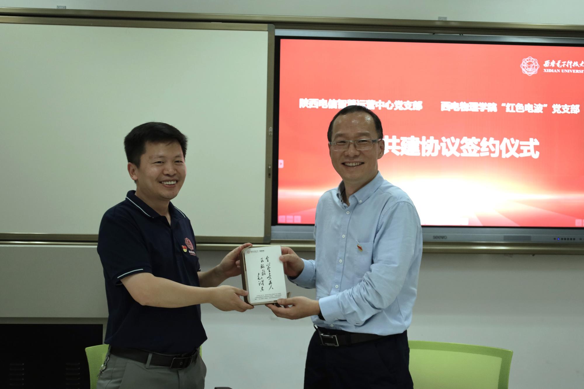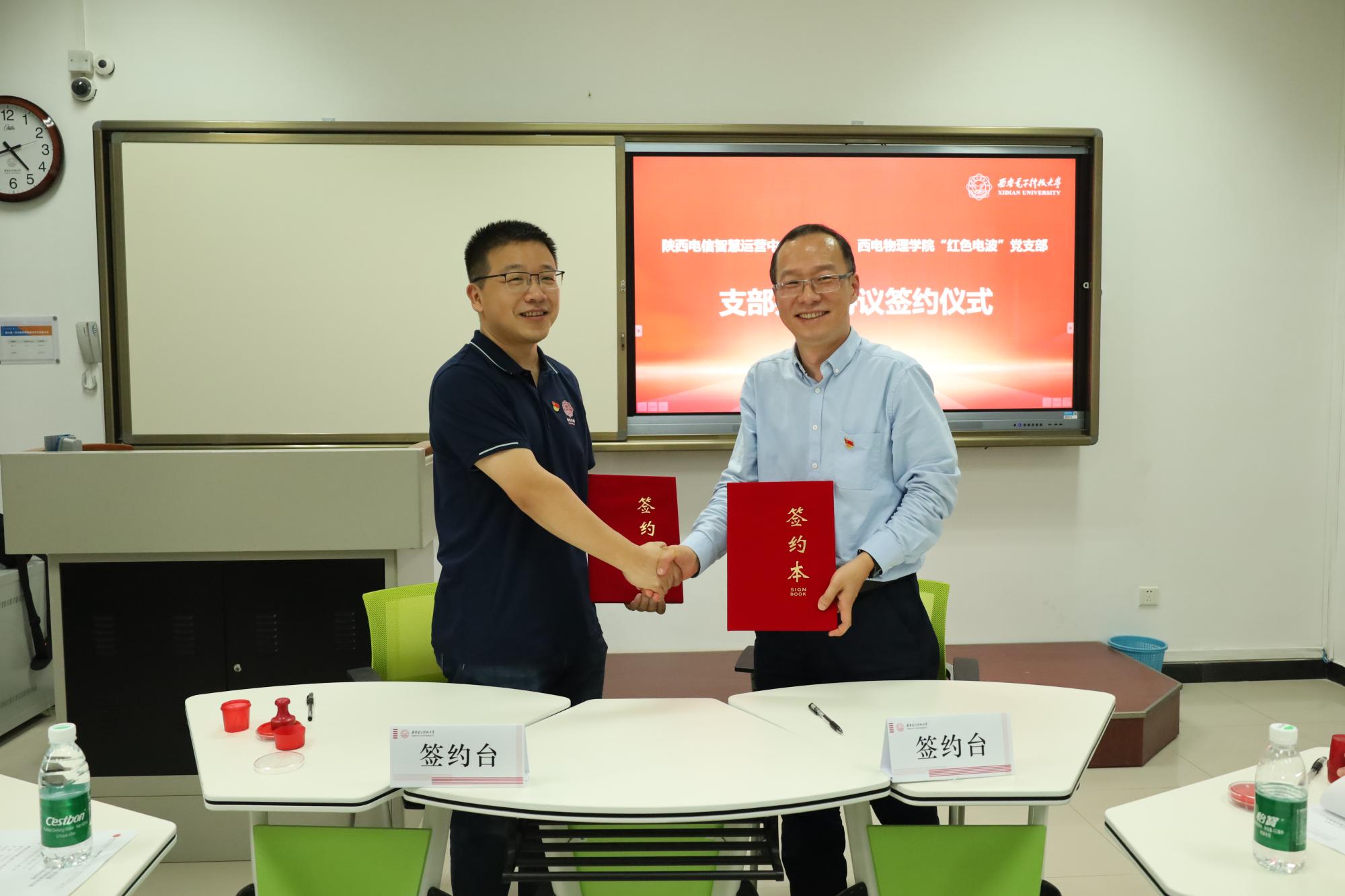 (通讯员:胡向涛)为增强党建与业务融合,加强交流协作,足球赌注网站 “红色电波”党支部与中国电信陕西公司智慧运营中心党支部开展“党建翼联”主题党日活动并举办支部共建签约仪式,陕西电信智慧运营中心党支部书记董小昌、组织委员黄敏、宣传委员兼纪检委员李西林、党务干事范若璐及全体支部成员,“红色电波”党支部书记李江挺、组织委员程明建、宣传委员魏仪文及支部师生党员参加了活动,物理公司党委书记黄军荣主持签约仪式。