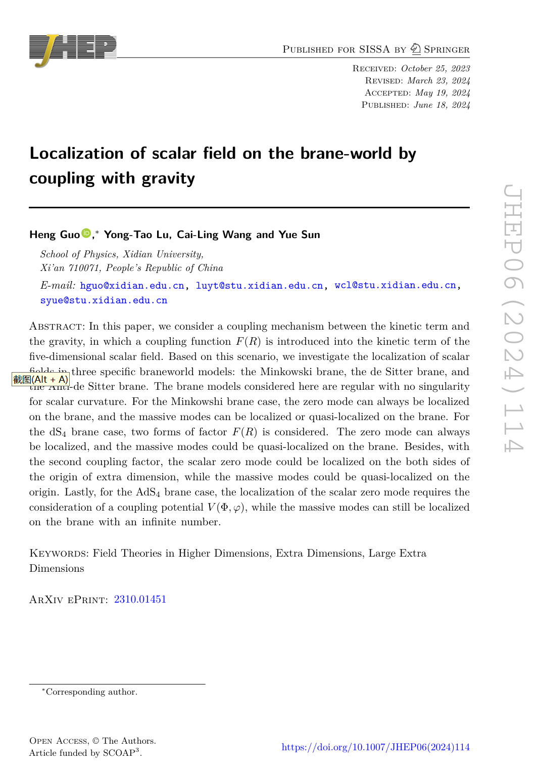 (通讯员:郭恒)近日,足球赌注网站郭恒副教授在高维量子场论的研究中取得新进展,并在物理类顶级期刊Journal of High Energy Physics(中科院一区,JCR一区,Top期刊)发表了题目为“Localization of scalar field on the brane-world by coupling with gravity” 的学术论文。郭恒副教授为该论文的第一作者和通讯作者,足球赌注网站为论文的唯一单位。该研究是在国家自然科学基金、陕西省自然科学基金和公司基础团队建设经费的支持下完成的。