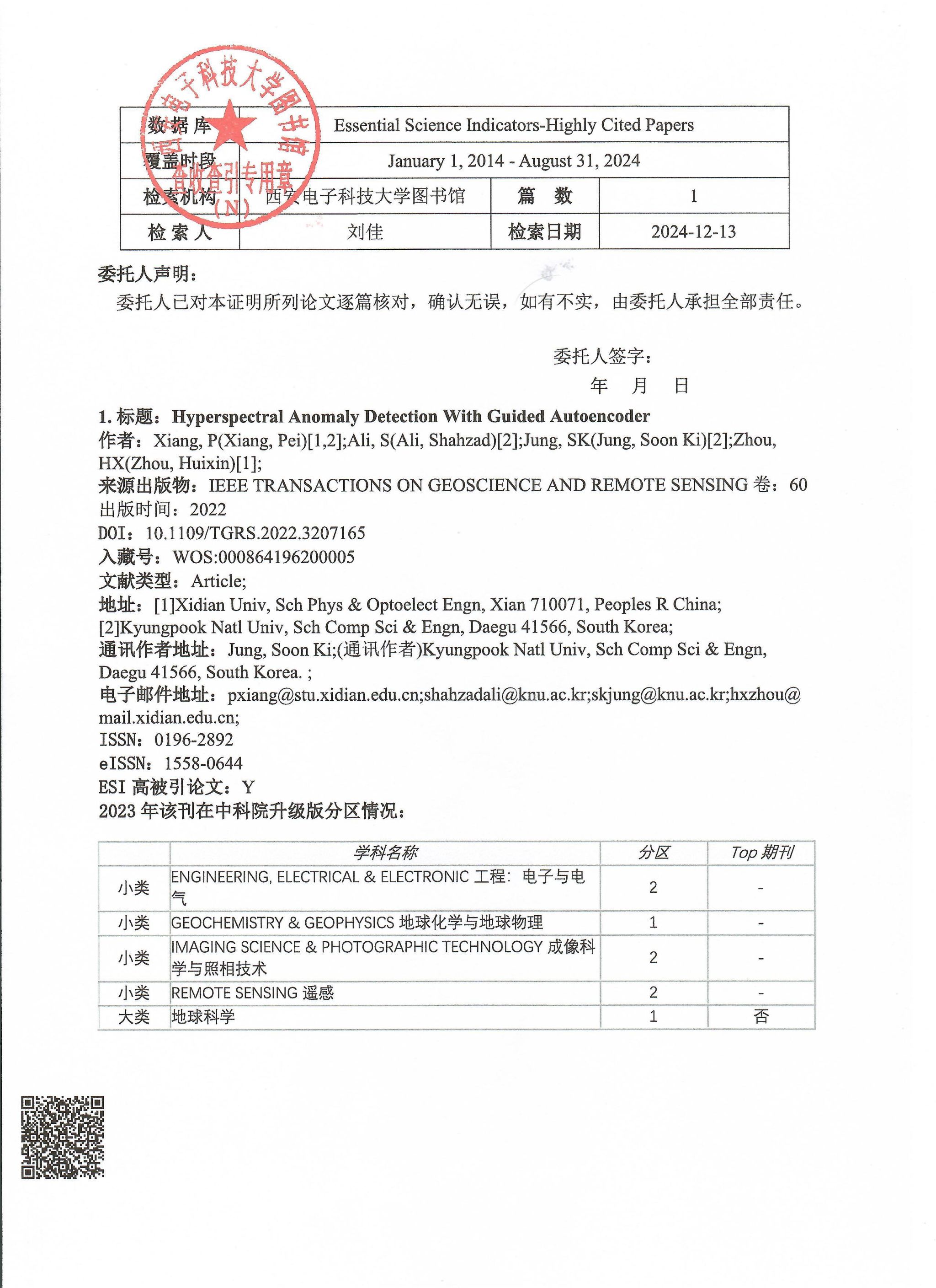 (通讯员:向培)据2024年12月Essential Science Indicators(简称ESI)统计数据显示,足球赌注网站周慧鑫教授团队成员向培以第一作者身份于2022年9月在《IEEE Transactions on Geoscience and Remote Sensing》(中科院一区、IF:7.5)上发表的研究成果“Hyperspectral anomaly detection with guided autoencoder”被ESI数据库遴选为高被引论文。