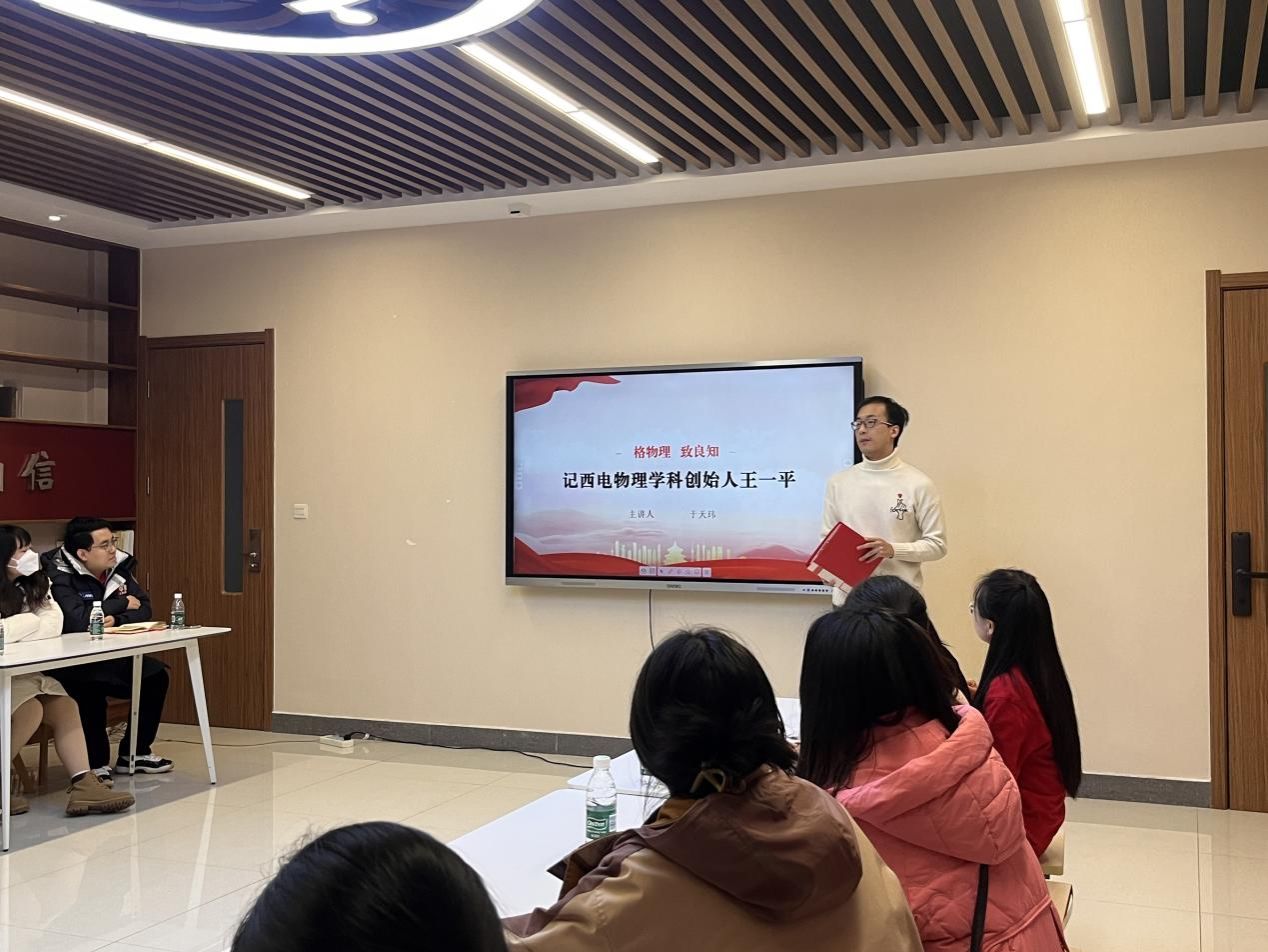 足球赌注网站硕士2023级党支部书记于天玮作了《格物理致良知——记西电物理学科创始人王一平》主题宣讲,讲述了西电物理学科创始人王一平的传奇故事,包括武汉大学地下党的革命经历、创办物理学科、物理团队班人才培养等,回顾了王一平教授一生的奋斗历程和革命、教育贡献,勉励同学们传承红色血脉,赓续科学家精神,为新时代物理学科和基础科学发展作出自己的贡献。