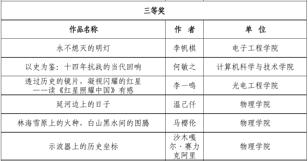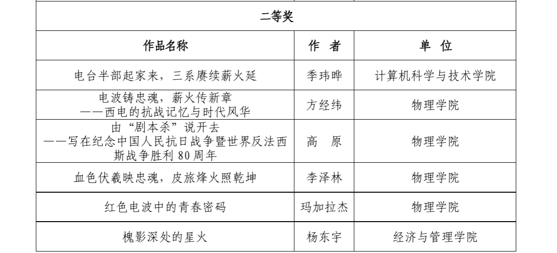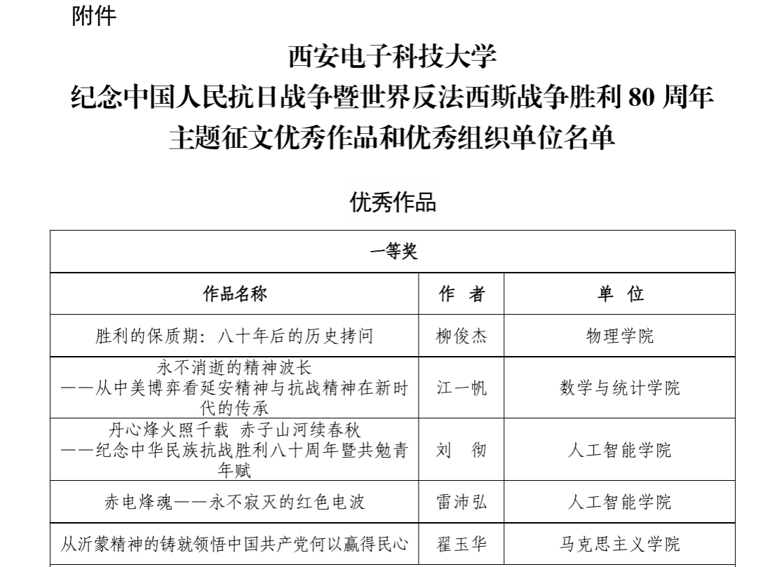 其中,柳俊杰作品《胜利的保质期:八十年后的历史拷问》荣获一等奖;李泽林《血色伏羲映忠魂,皮旅烽火照乾坤》等4篇作品获得二等奖;马樱《林海雪原上的火种,白山黑水间的图腾》等3篇作品获得三等奖,足球赌注网站共8篇作品入选优秀作品,并获评“优秀组织单位”。获奖作品以物理人独特视角诠释抗战精神,将专业特色与红色基因深度融合,充分展现公司“课程思政”建设成效。