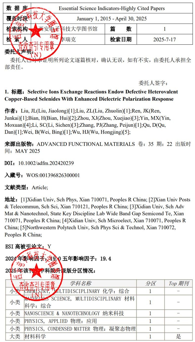 (通讯员:刘骄龙)据2025年7月Essential Science Indicators(简称ESI)统计数据显示,西电足球赌注网站魏兵教授团队青年教师刘骄龙以第一作者身份于2025年在《Advanced Functional Materials》(中科院I区TOP期刊,IF=19.0)上发表的研究成果“Selective Ions Exchange Reactions Endow Defective Heterovalent Coppe‐Based Selenides with Enhanced Dielectric Polarization Response”被ESI数据库遴选为高被引论文。
